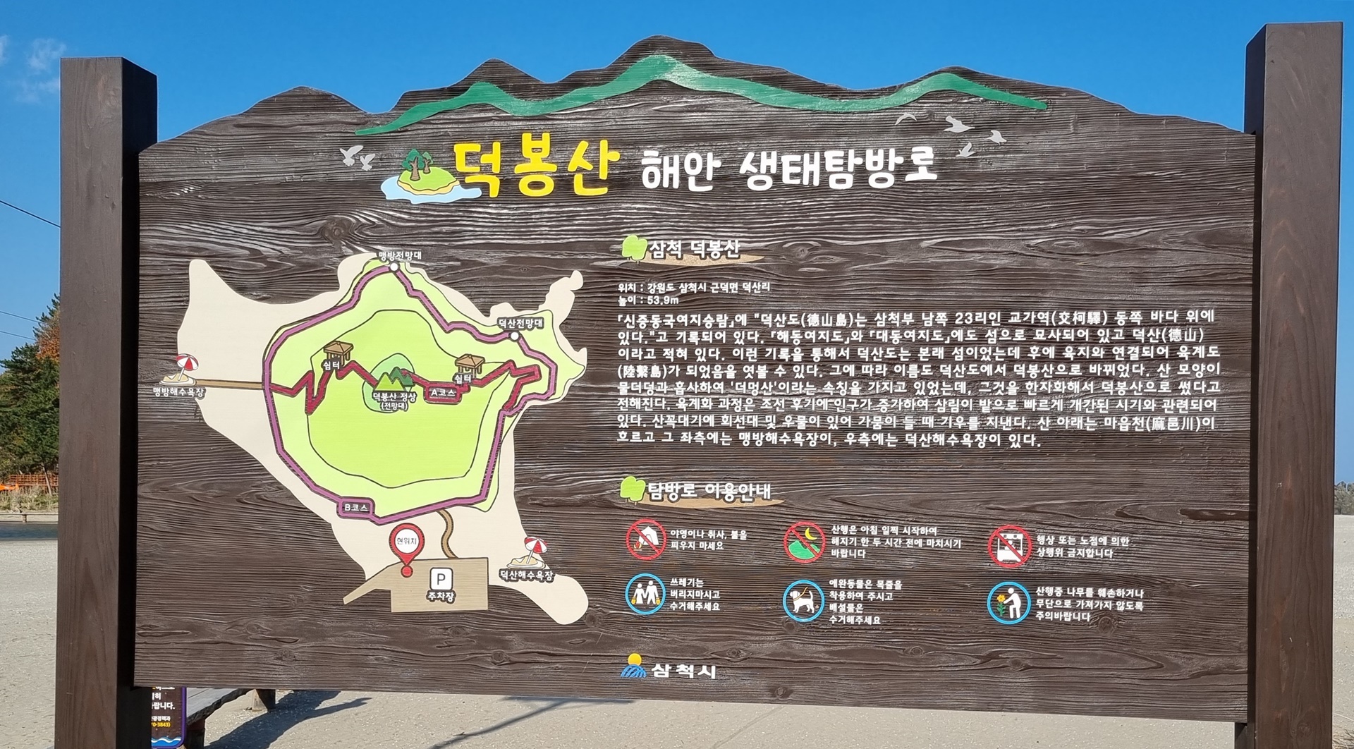 「해동여지도」와「대동여지도」기록을 통해 본래 섬이었다가 후에 육지와 연결되었음을 알 수 있는 덕봉산은 산모양이 물독과 흡사하여 ‘더멍산’이라고 불렸다고 전해진다. 군 경계 철책을 철거와 함께 해안생태탐방로가 개방되면서 53년 만에 숨겨진 비경이 공개되었다. 대나무 숲이 우거진 산책로를 따라 전망대로 올라가는 내륙코스(317m)와 해상 기암괴석을 감상할 수 있는 해안코스(626m)로 구성되어 있으며 산책로를 따라 정상에 오르면 상쾌한 해풍과 함께 탁 트인 바다 풍경과 맹방해변, 덕산해변을 한 눈에 감상할 수 있다.