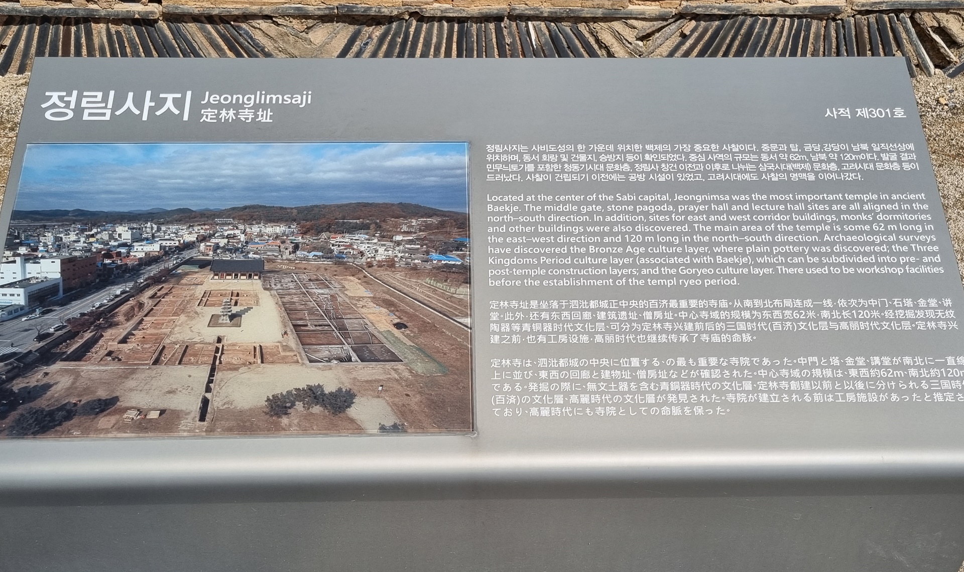 ํ์ฌ ์ ํฐ์๋ ๋ฐฑ์ ์๋์ ์ํ์ธ ๋ถ์ฌ์ ๋ฆผ์ฌ์ง์ค์ธต์ํ(๊ตญ๋ณด ์ 9ํธ)๊ณผ ๊ณ ๋ ค์๋ ๋ ๋ง๋ค์ด์ง ๋์ด 5.62m์ ์๋ถ์ธ ๋ถ์ฌ ์ ๋ฆผ์ฌ์ง ์์กฐ์ฌ๋์ข์(๋ณด๋ฌผ ์ 108ํธ)์ด ๋จ์ ์์ด ๋ฐฑ์ ์๋๋ถํฐ ๊ณ ๋ ค์๋๊น์ง ๊ณ์ ๋ฒํต์ด ์ด์ด์ ธ ์์์ ์ ์ ์๋ค. ์ค๋ฌธ·ํ·๊ธ๋น·๊ฐ๋น์ด ๋จ๋ถ ์์ค์ ์์ ์ผ์ง์ ์ผ๋ก ๋์ด๊ณ ๊ฐ๋น ์ข์ฐ์ ๋ถ์๊ฑด๋ฌผ๊ณผ ์ค๋ฌธ์ ์ฐ๊ฒฐํ๋ ํ๋(ๅปป๏คจ)์ด ๋๋ฌ์ธ๊ณ ์๋ ‘์ผํ์๊ฐ๋(ไธๅกๅผไผฝ๏คฃ)’ ๋ฐฐ์น์ด๋ค. ์ด๋ ์ ๋ฆผ์ฌ๋ฟ๋ง ์๋๋ผ ๋ถ์ฌ์์ ๋ฐ๊ฒฌ๋ ๋ค๋ฅธ ์ฌ์ฐฐ์๋ ํ์ธ๋๋ฏ๋ก ๋ฐฑ์ ์ฌ๋น์๋์ ์ ํ์ ์ธ ๊ฐ๋๋ฐฐ์น ์์์ด๋ผ ํ ์ ์๋ค. ๋จ, ์ ๋ฆผ์ฌ์ง๋ ๋ถ์ชฝ์ด ๋์ ์ฌ๋ค๋ฆฌ๊ผด ํ๋ฉด์ด๋ค. ์ค๋ฌธ ๋ฐ์๋ ๋·์ ์์ชฝ์ผ๋ก ๊ฐ๊ฐ ์ฐ๋ชป์ ํ์ ๋ค๋ฆฌ๋ฅผ ํตํ์ฌ ๊ฑด๋๊ฐ๊ฒ ํ์๋ค. ์ด ์ฐ๋ชป์ ํ์ฌ๊น์ง ๋ฐ๊ตด๋ ๊ฒ ์ค ๊ฐ์ฅ ์ค๋๋ ๊ฒ์ด๋ฏ๋ก, ์ผ๊ตญ์๋ ์ฌ์ฐฐ ์กฐ๊ฒฝ ์ฐ๊ตฌ์ ๊ท์คํ ์๋ฃ์ด๋ค.