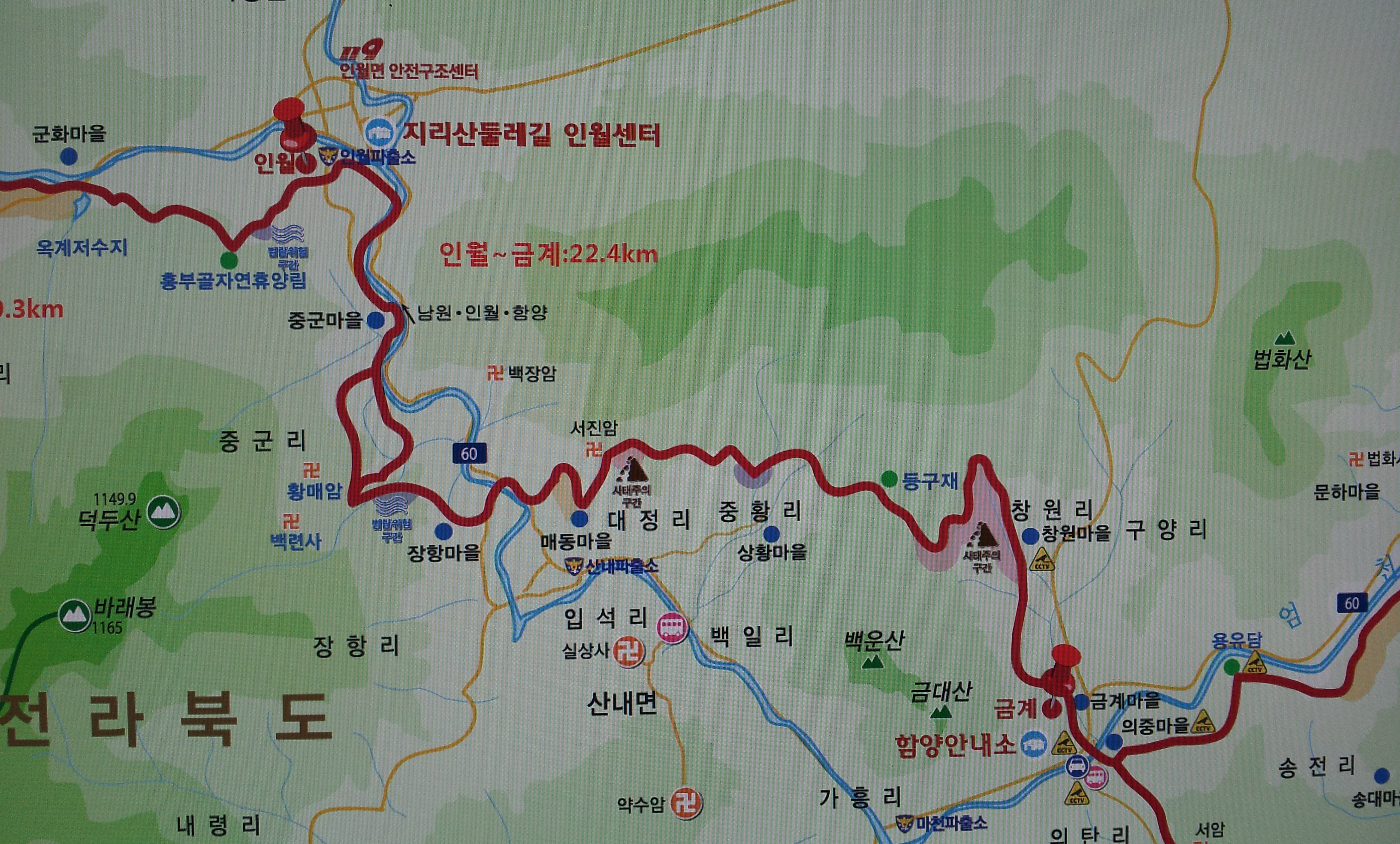 ์ ๋ผ๋ถ๋ ๋จ์์ ์ธ์๋ฉด ์ธ์๋ฆฌ์ ๊ฒฝ์๋จ๋ ํจ์๊ตฐ ๋ง์ฒ๋ฉด ์ํ๋ฆฌ๋ฅผ ์๋ 20.5km์ ์ง๋ฆฌ์ฐ๋๋ ๊ธธ. ์ธ์-๊ธ๊ณ๊ตฌ๊ฐ์ ์ง๋ฆฌ์ฐ๋๋ ๊ธธ ์๋ฒ๊ตฌ๊ฐ ๊ฐํต์ง์ธ ์ง๋ฆฌ์ฐ๋ถ๋ถ์ง์ญ ๋จ์์ ์ฐ๋ด๋ฉด ์ํฉ๋ง์๊ณผ ํจ์๊ตฐ ๋ง์ฒ๋ฉด ์ฐฝ์๋ง์์ ์๋ ์ ๊ณ ๊ฐฏ๊ธธ ๋ฑ๊ตฌ์ฌ๋ฅผ ์ค์ฌ์ผ๋ก ์ง๋ฆฌ์ฐ ์ฃผ๋ฅ์ ์ ์กฐ๋งํ๊ณ , ๋๊ฒ ํผ์ณ์ง ๋ค๋๋ ผ๊ณผ 6๊ฐ์ ์ฐ์ด ๋ง์์ ์ง๋ ์์ฒ๊ฐ์ผ๋ก ์ด์ด์ง๋ ๊ธธ์ด๋ค. ์ ๋ฐฉ๊ธธ, ๋๋ก, ์ฐจ๋, ์๋, ์ฒ๊ธธ๋ฑ์ด ์ ๊ตฌ๊ฐ์ ๊ณจ๊ณ ๋ฃจ ์์ฌ์๊ณ , ๋ํ ์ ๋ฐฉ, ๋ง์, ์ฐ๊ณผ ๊ณ๊ณก์ ๊ณ ๋ฃจ ๋๋ ์ ์๋ค.