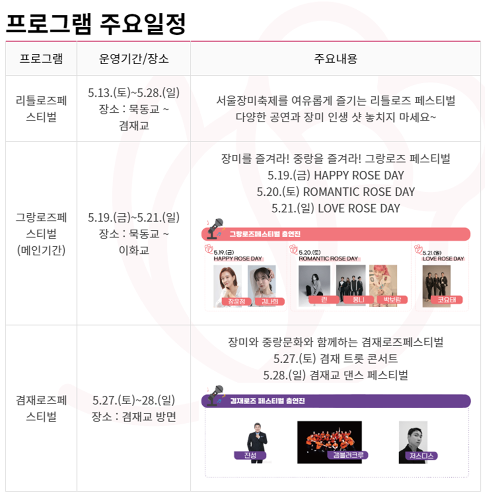 - ๋ฆฌํ๋ก์ฆํ์คํฐ๋ฒ(์ค๋์ฅ๋ฏธ๊ณต์ ์ ์ญ) : 5.13.(ํ ) ~ 5.18.(๋ชฉ), 5.22.(์) ~ 5.26.(๊ธ)- ๊ทธ๋๋ก์ฆํ์คํฐ๋ฒ(์คํ์ฒด์ก๊ณต์) : 5.19.(๊ธ) ~ 5.21.(์ผ)