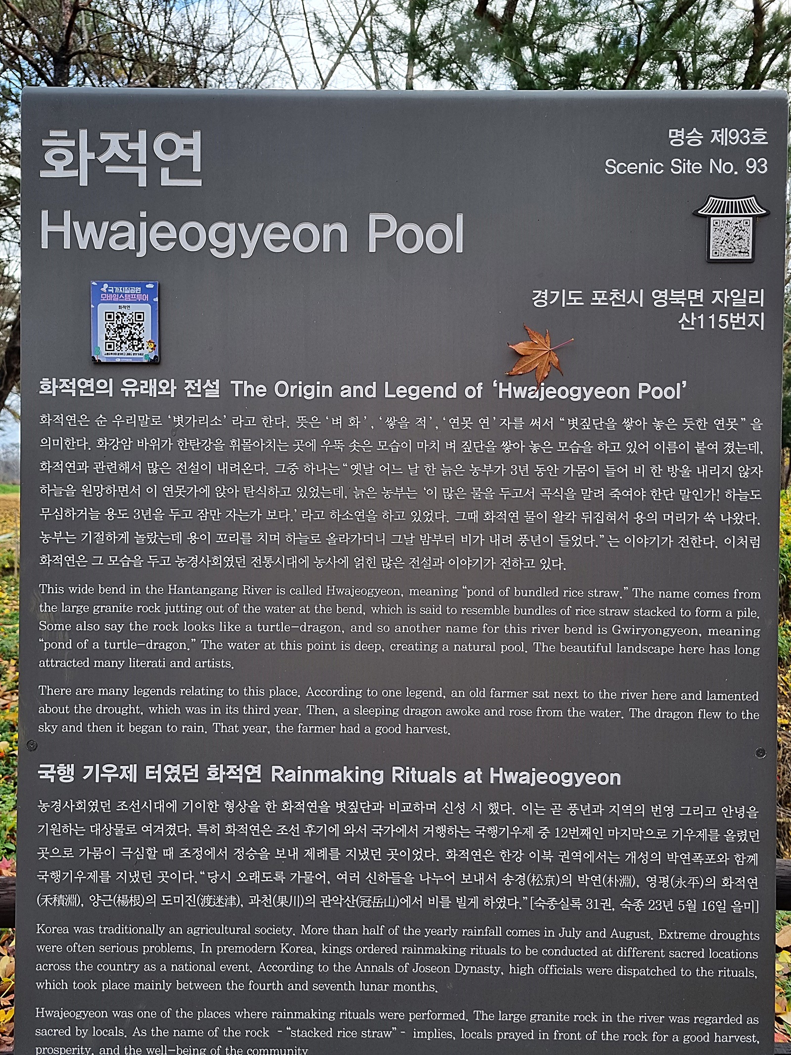 ํ์ ์ฐ์ ์๋ก๋ถํฐ ๋๋ฆฌ ์๋ ค์ง ๋ช ์น์ด์๊ณ , ๊ธฐ์ฐ์ ๋ฅผ ์ง๋ด๋ ๊ณณ์ด์๋ค. ์ ์ค์๋ ๊ทน์ฌํ ๊ฐ๋ญ์ ๋๋ถ๊ฐ ์ฐ๋ชป๊ฐ์ ์์ ํ์ํ์ ์ฉ์ด ํ๋๋ก ์ฌ๋ผ๊ฐ ๋น๋ฅผ ๋ด๋ ธ๋ค๋ ์ด์ผ๊ธฐ๊ฐ ์ ํ๋ค.์กฐ์ ์ค๊ธฐ ์ธ์กฐ, ํจ์ข ์๊ธฐ ๋ฌธ์ธ์ธ ์ด๊ฒฝ์์ ๋ฌธ์ง ใ๋ฐฑํ์ ์์งใ์ ํ์ ์ฐ์์ ๊ธฐ์ฐ์ ๋ฅผ ์ฌ๋ ธ๋ค๋ ๊ธฐ๋ก์ด ์๋ค.