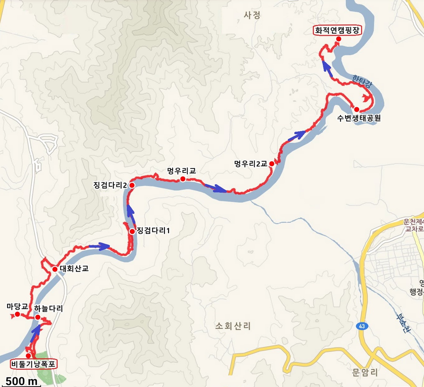 โํ์ ์ฐ-ํ์ ์ฐ์๋ณ๊ณต์-๋ฉ์ฐ๋ฆฌ2๊ต-๋ฉ์ฐ๋ฆฌ๊ต-์ฃ๋๋ฌด์ฒ๊ธธ-๋ํ์ฐ๊ต ๋ฑ์ฐ๋ก์ ๊ตฌ-ํ๋๋ค๋ฆฌ-๋น๋๊ธฐ๋ญํญํฌ(์ฝ9km/4์๊ฐ)